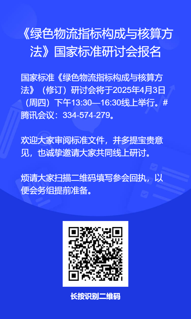 国家标准《绿色物流指标构成与核算方法》(修订)研讨会将于明日(4月3日)下午13:30-16:30线上举行,腾讯会议号:334-574-27...