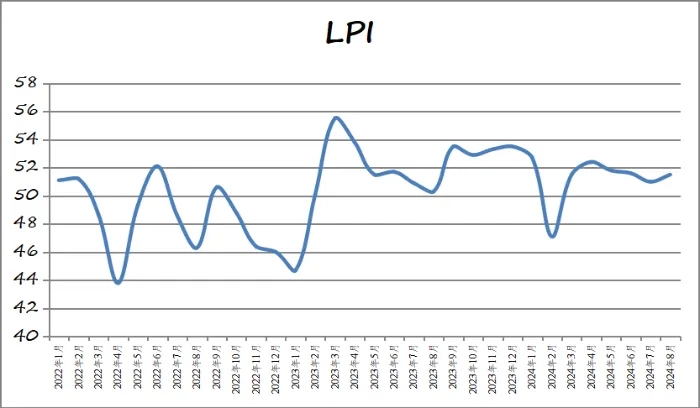 中国物流与采购联合会发布的2024年8月份中国物流业景气指数为51.5%,环比回升0.5个百分点,继续处于扩张区间。8月份随着促投资、稳增长各项政策逐步落实和部分地区极端天气影响减弱,产业链、供应链上下游联动加速,物流业务总量和新订单业务量增速加快,东中西部地区均衡增长;同时,数据反映出企业微观活力改善,盈利改观,预期回升。