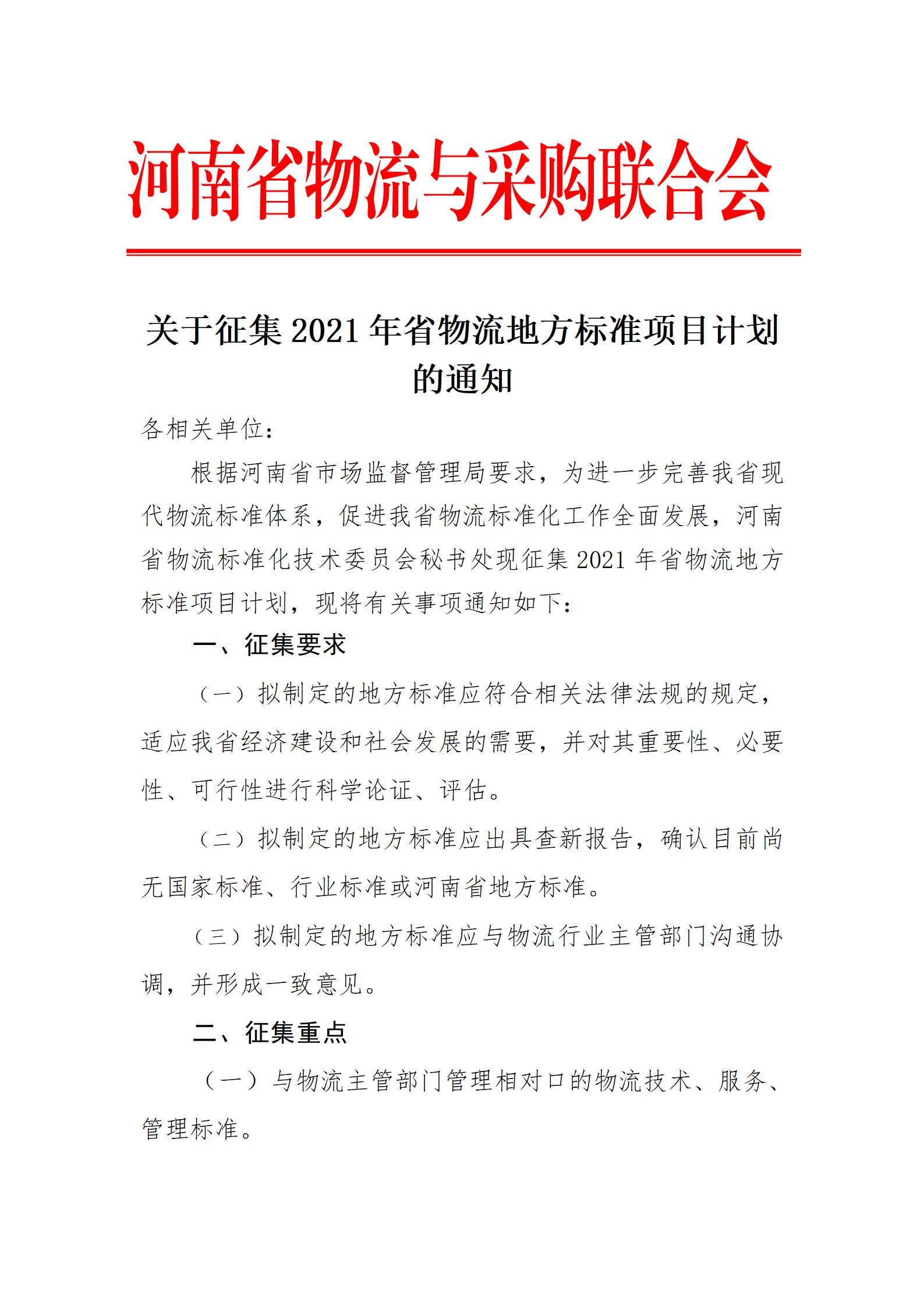 关于征集2021年省物流地方标准项目计划的通知