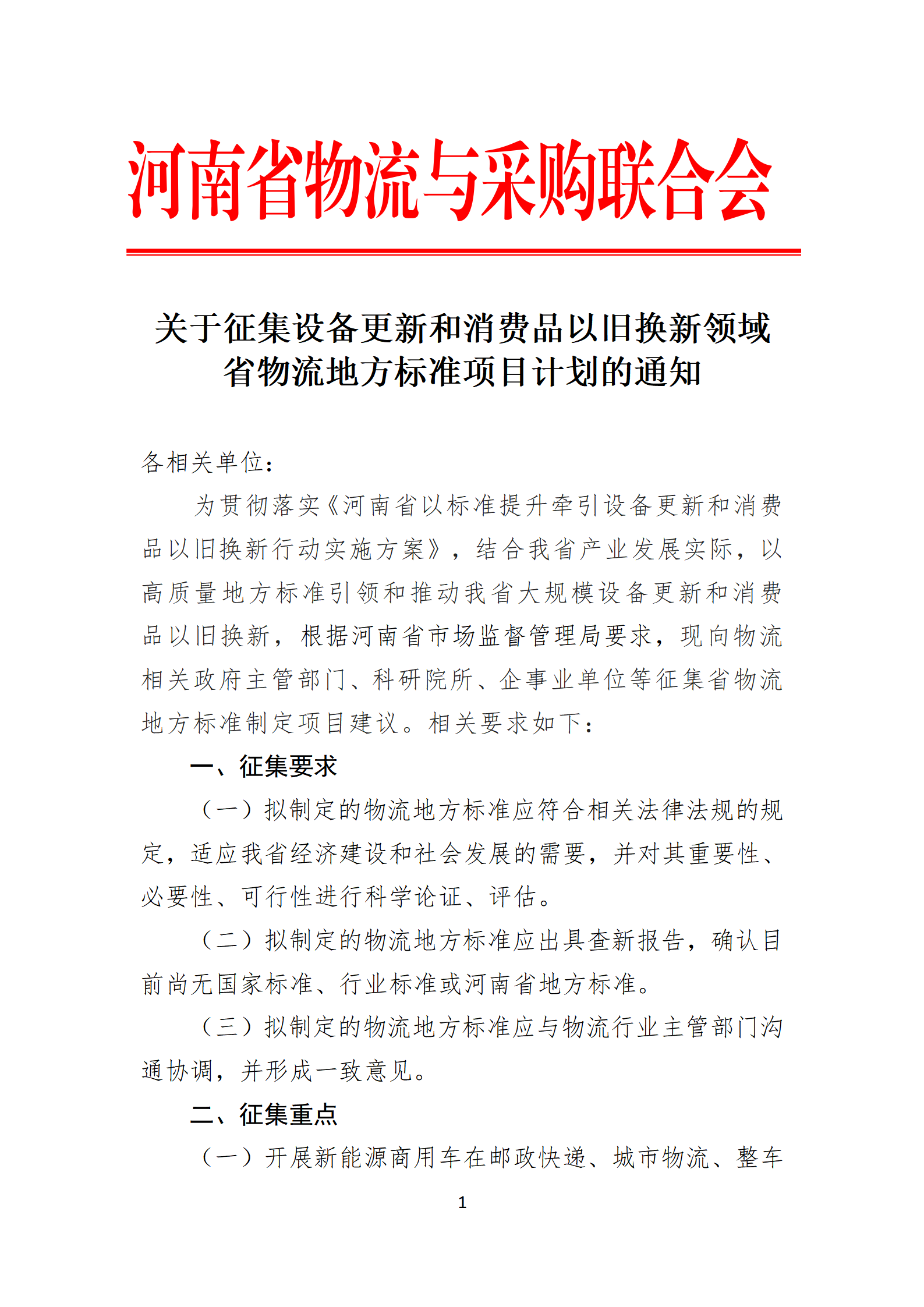 关于征集设备更新和消费品以旧换新领域省物流地方标准项目计划的通知