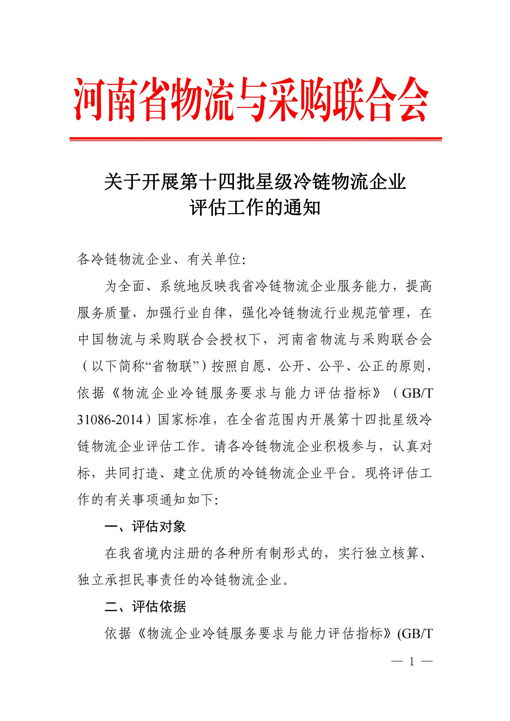 关于开展第十四批星级冷链物流企业 评估工作的通知