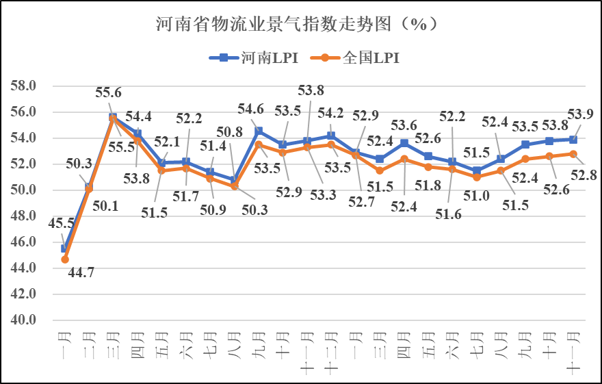 11月份,全省物流需求延续扩张态势,物流业景气指数达53.9%,环比上升0.1个百分点,高于全国平均水平1.1个百分点。