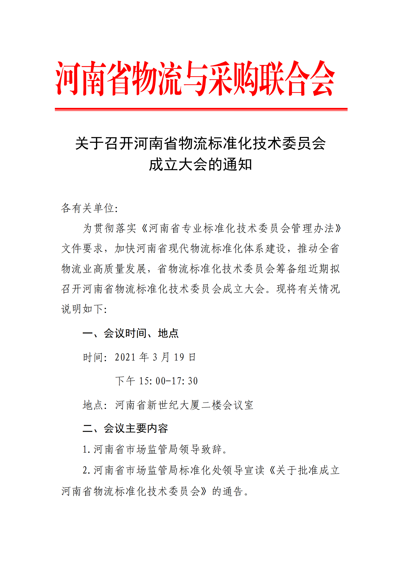关于召开河南省物流标准化技术委员会成立大会的通知